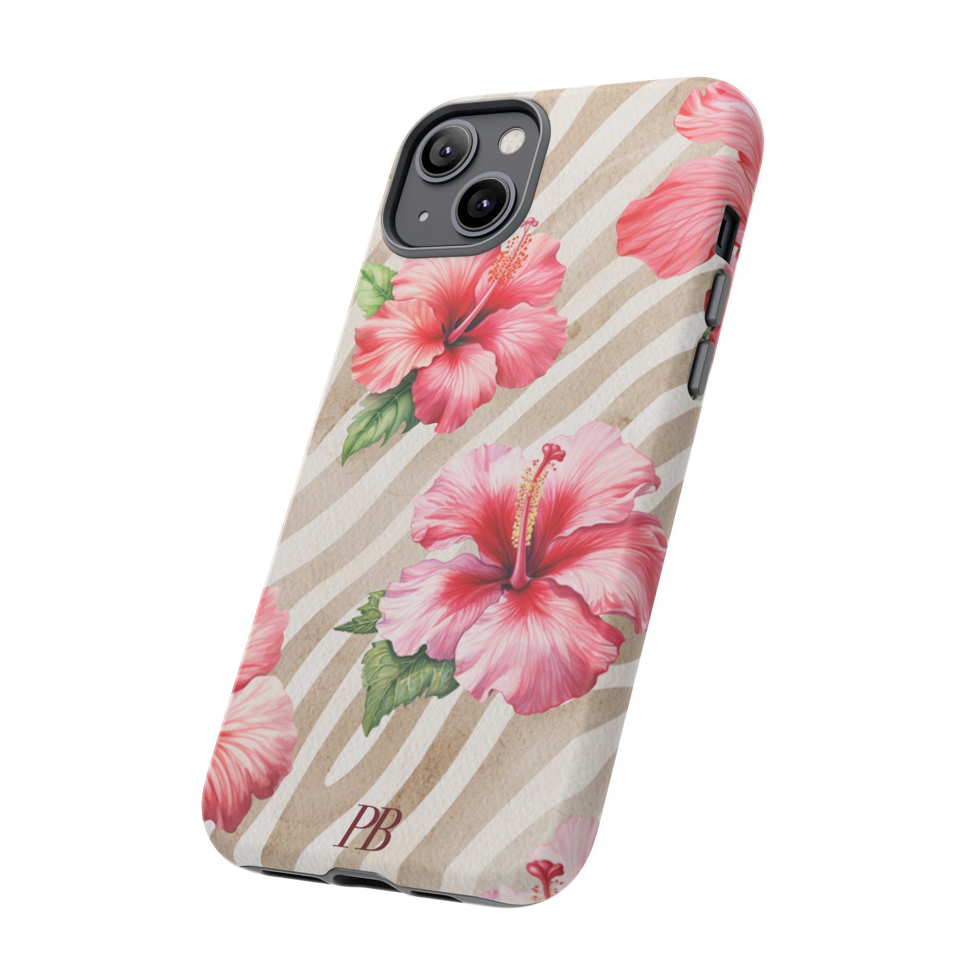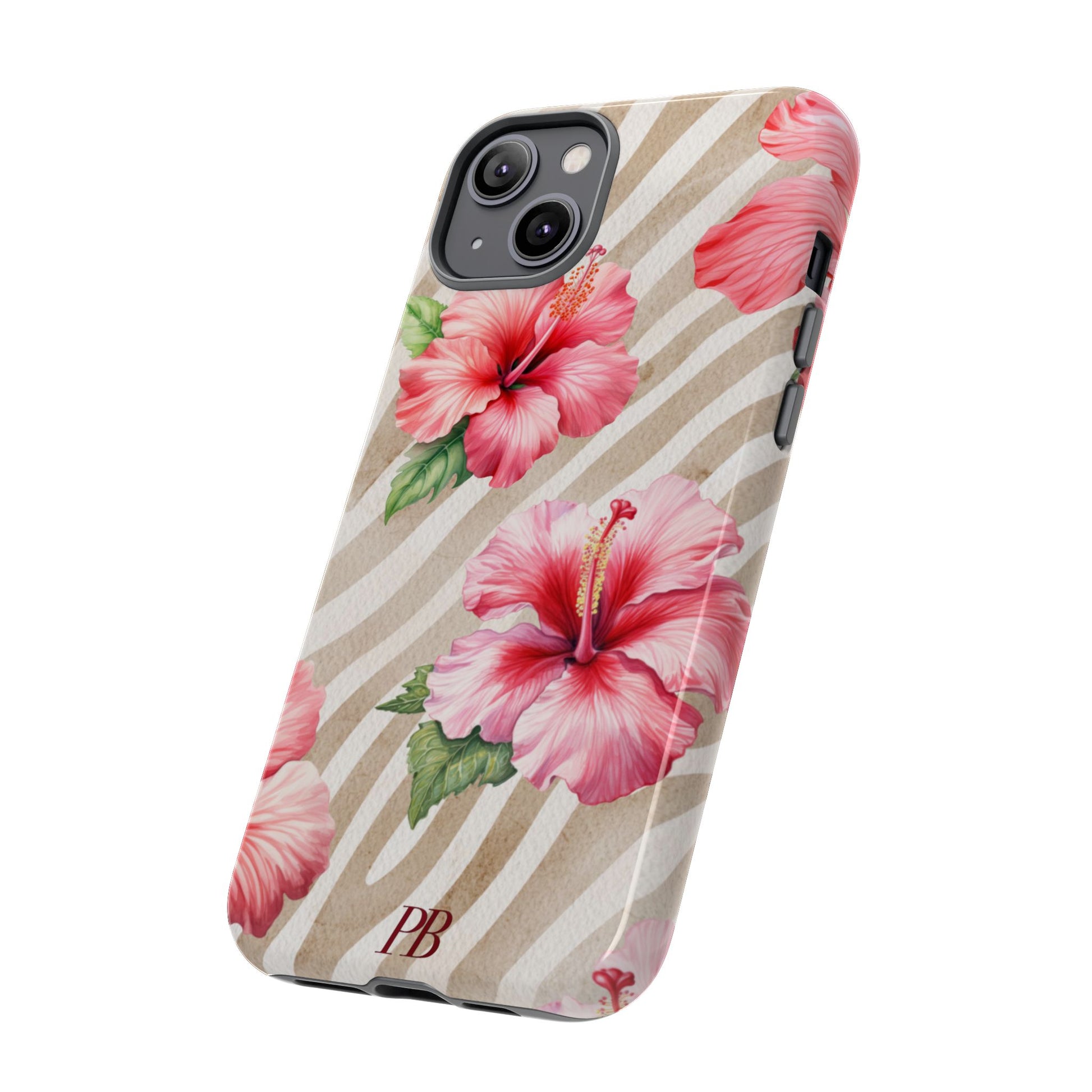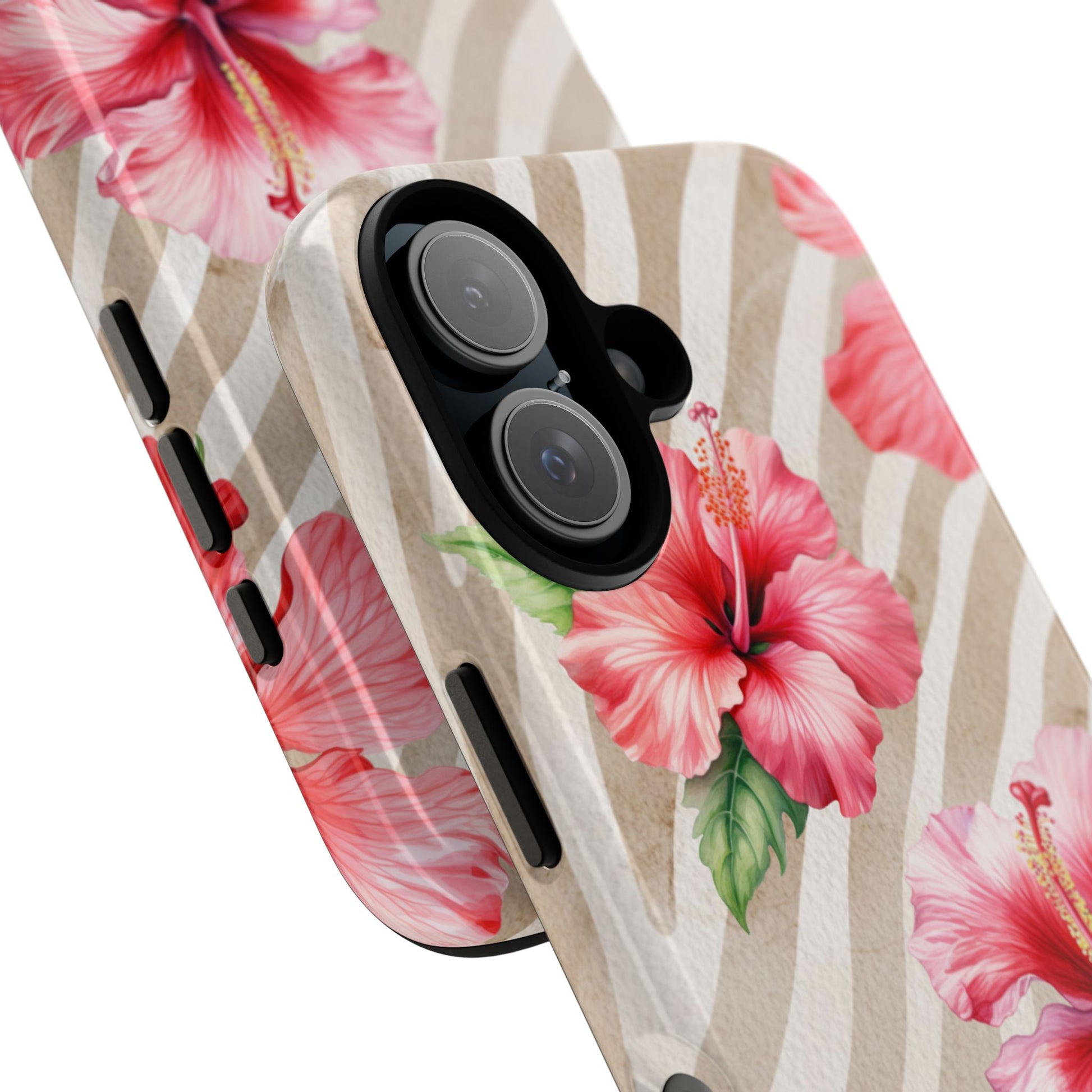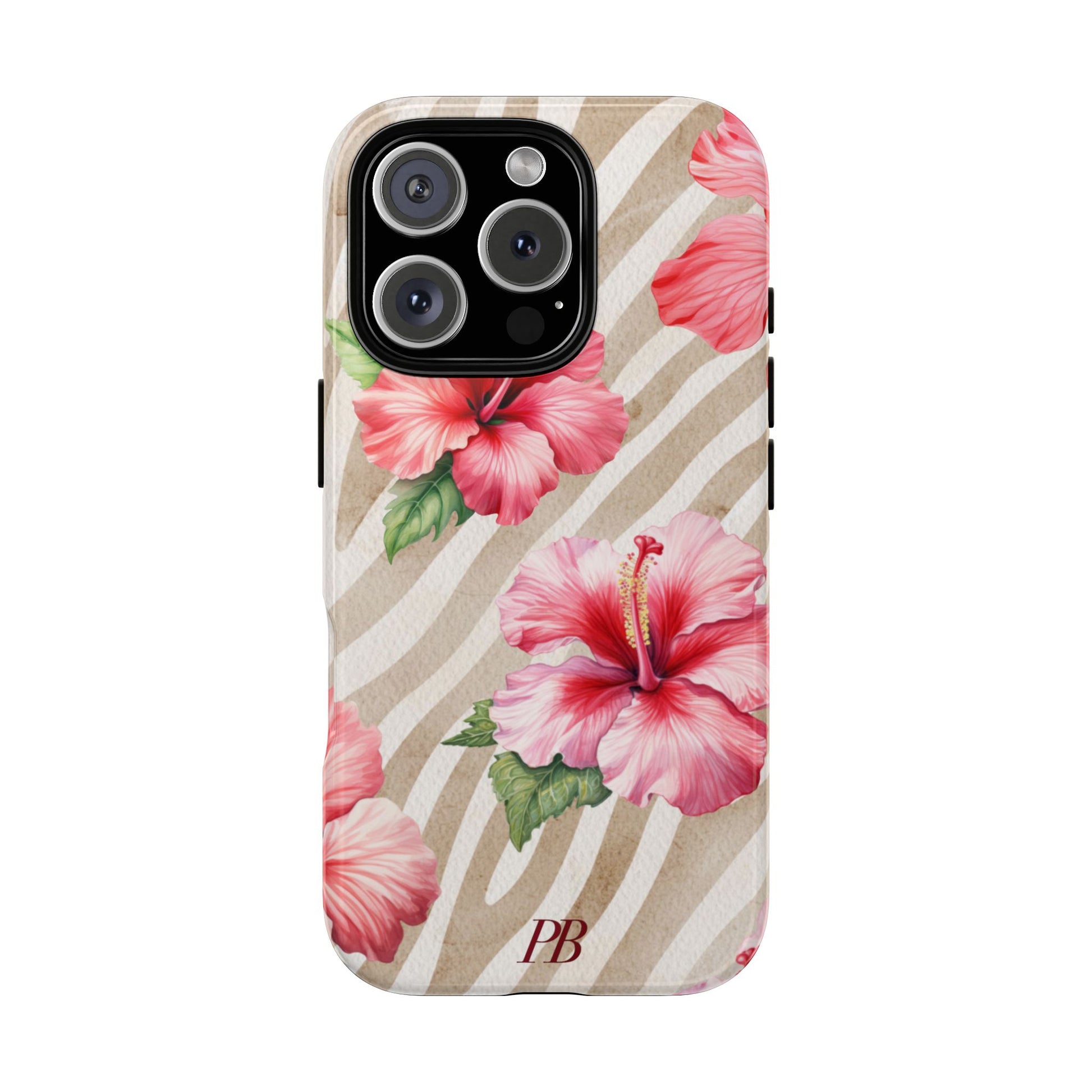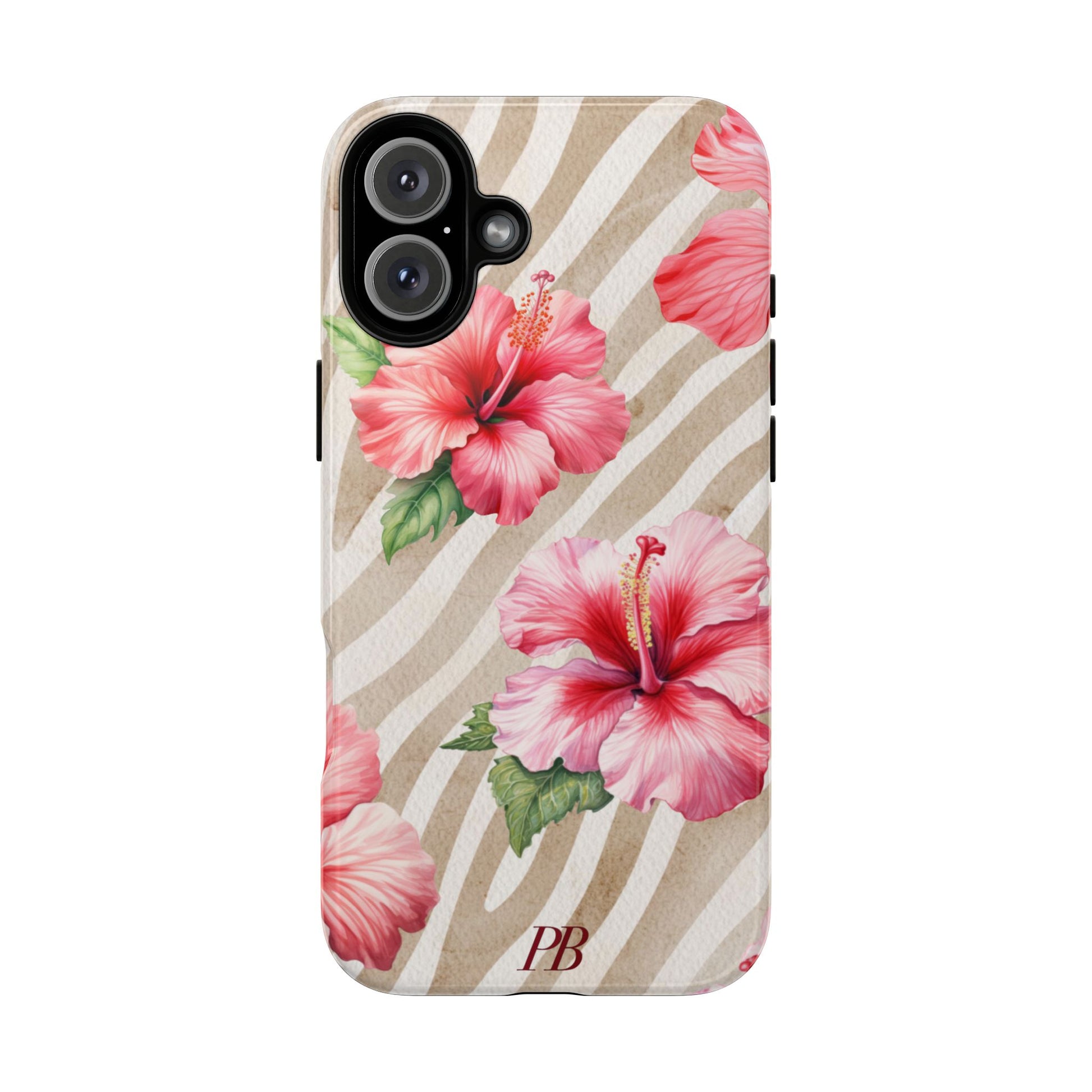 This bold design features a striking brown-toned tiger pattern as the backdrop, while a vibrant pink hibiscus blooms on top, adding a fierce yet feminine touch.
