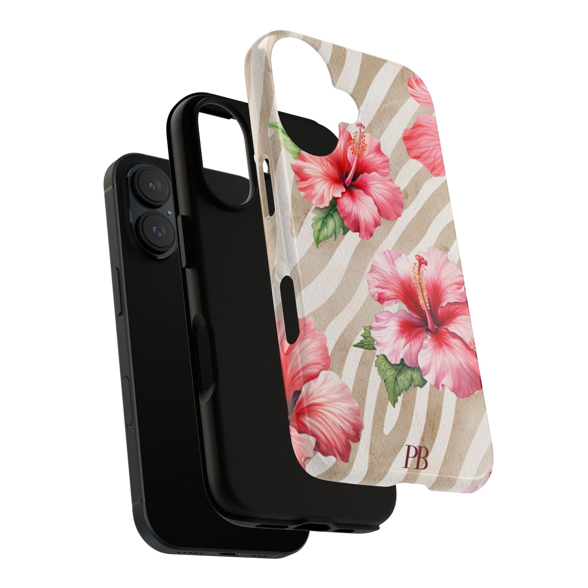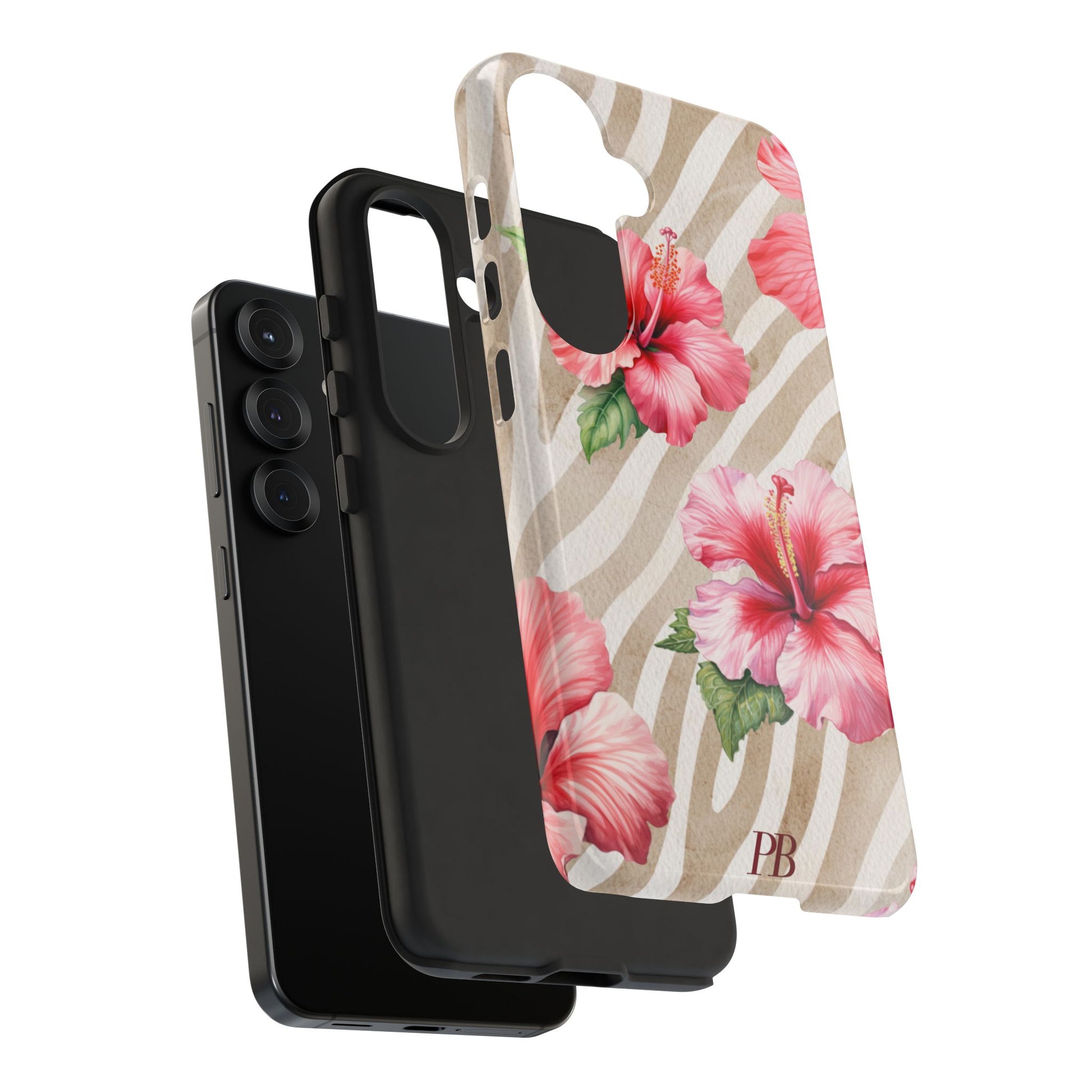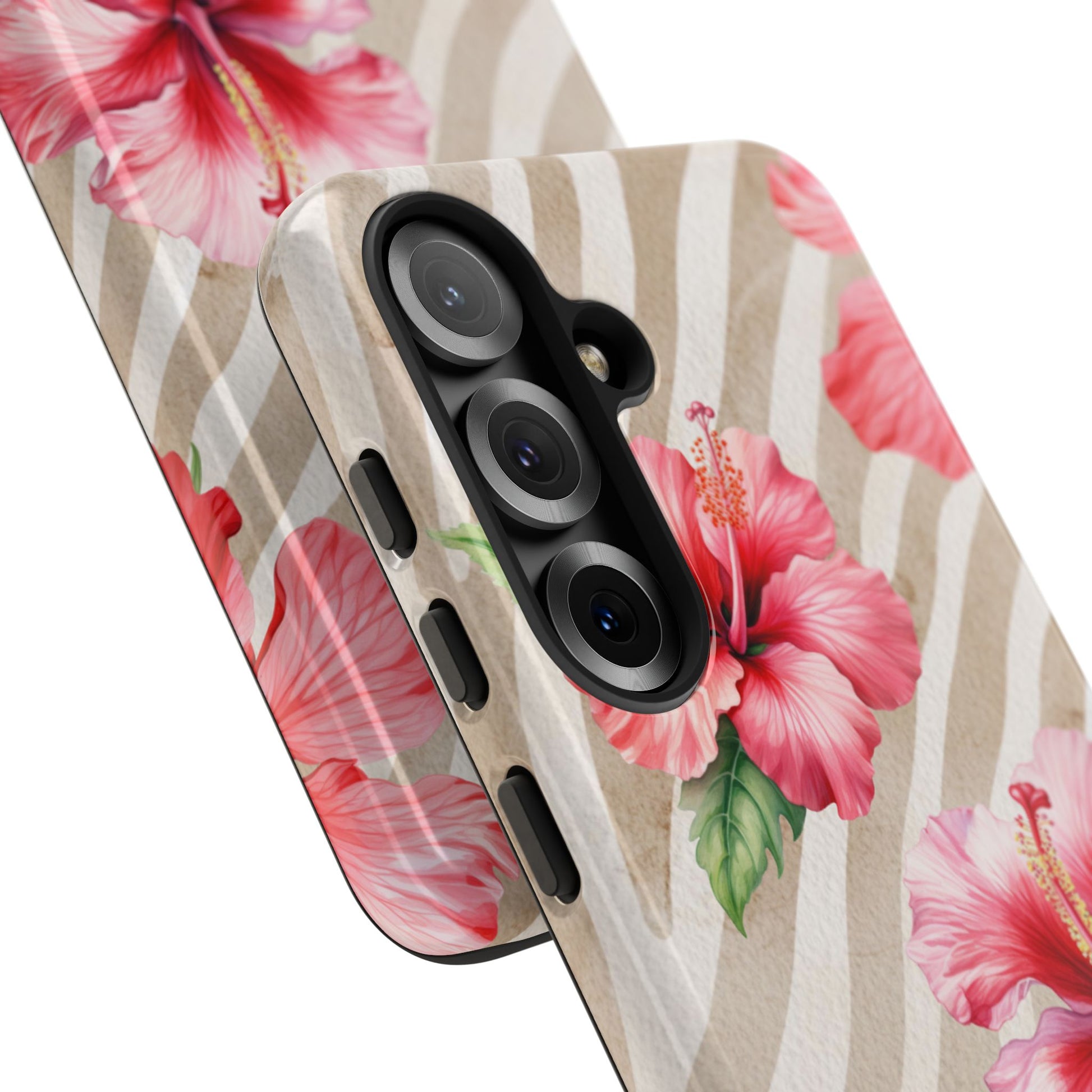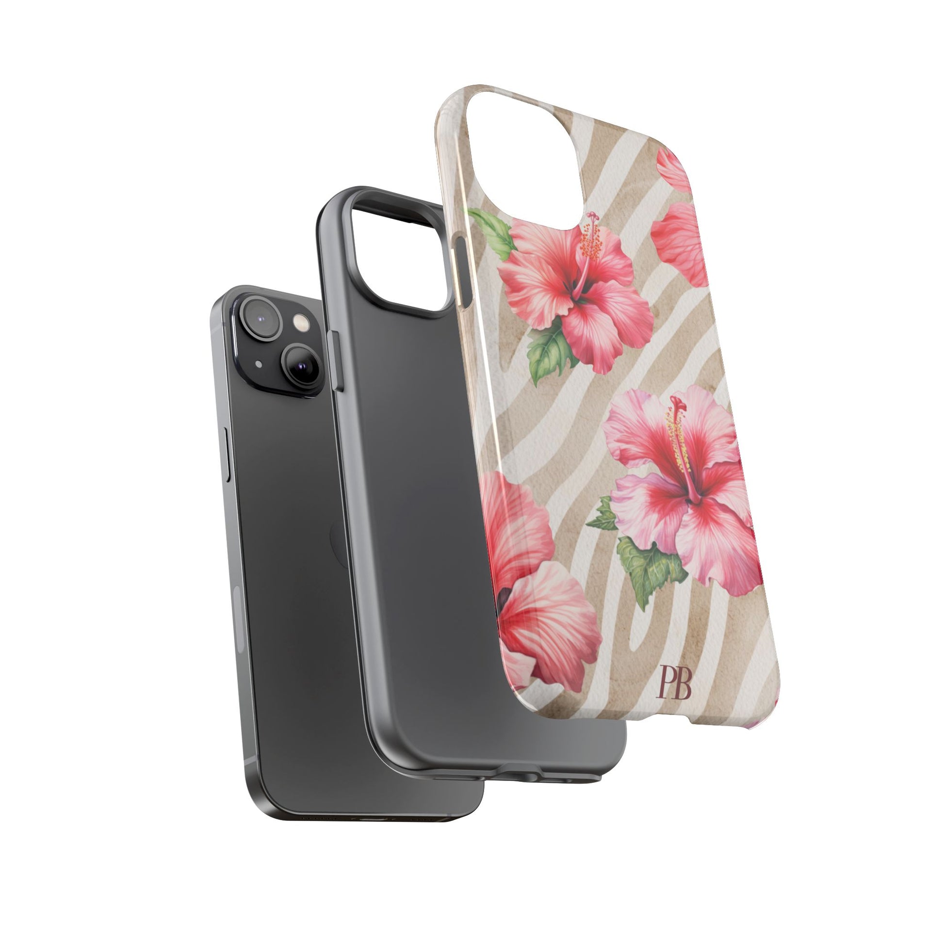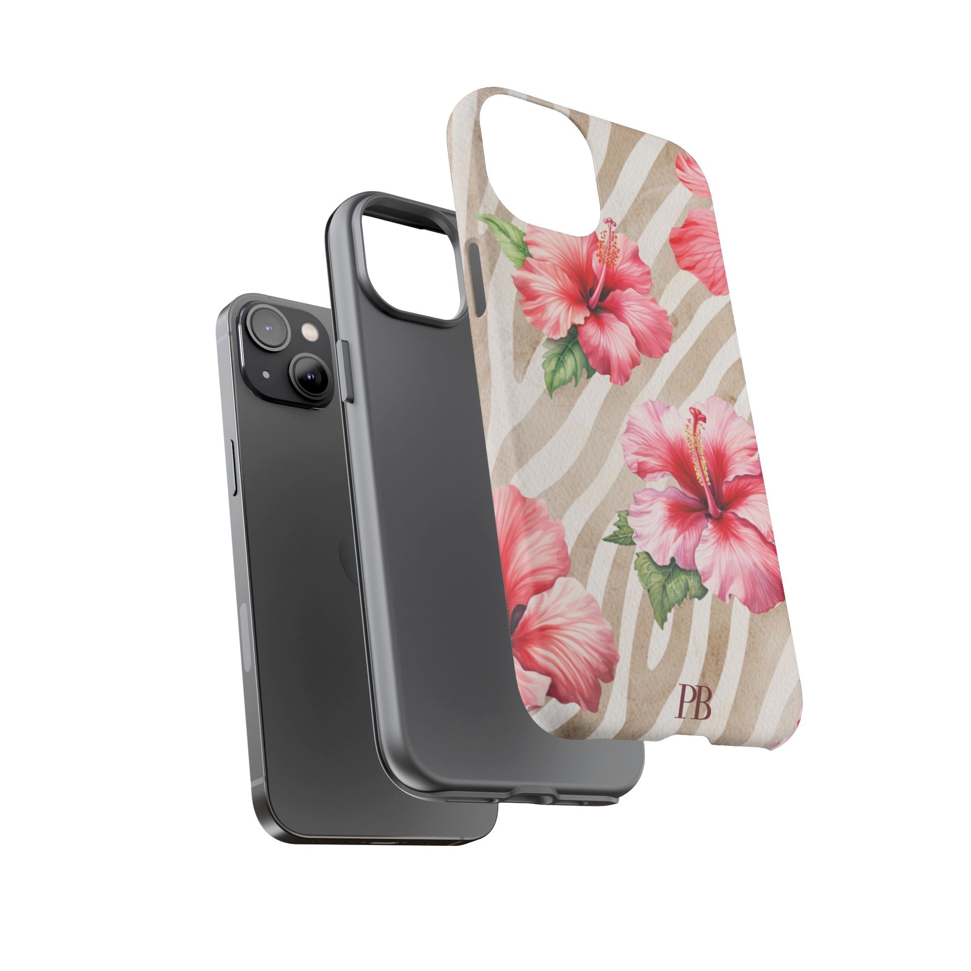 This bold design features a striking brown-toned tiger pattern as the backdrop, while a vibrant pink hibiscus blooms on top, adding a fierce yet feminine touch.