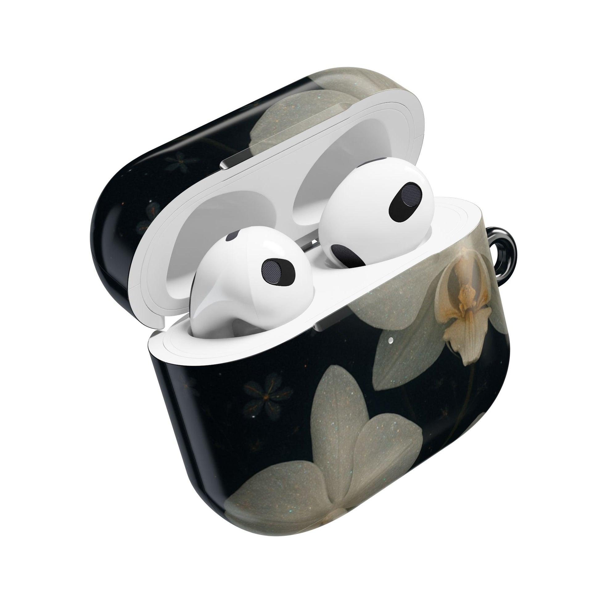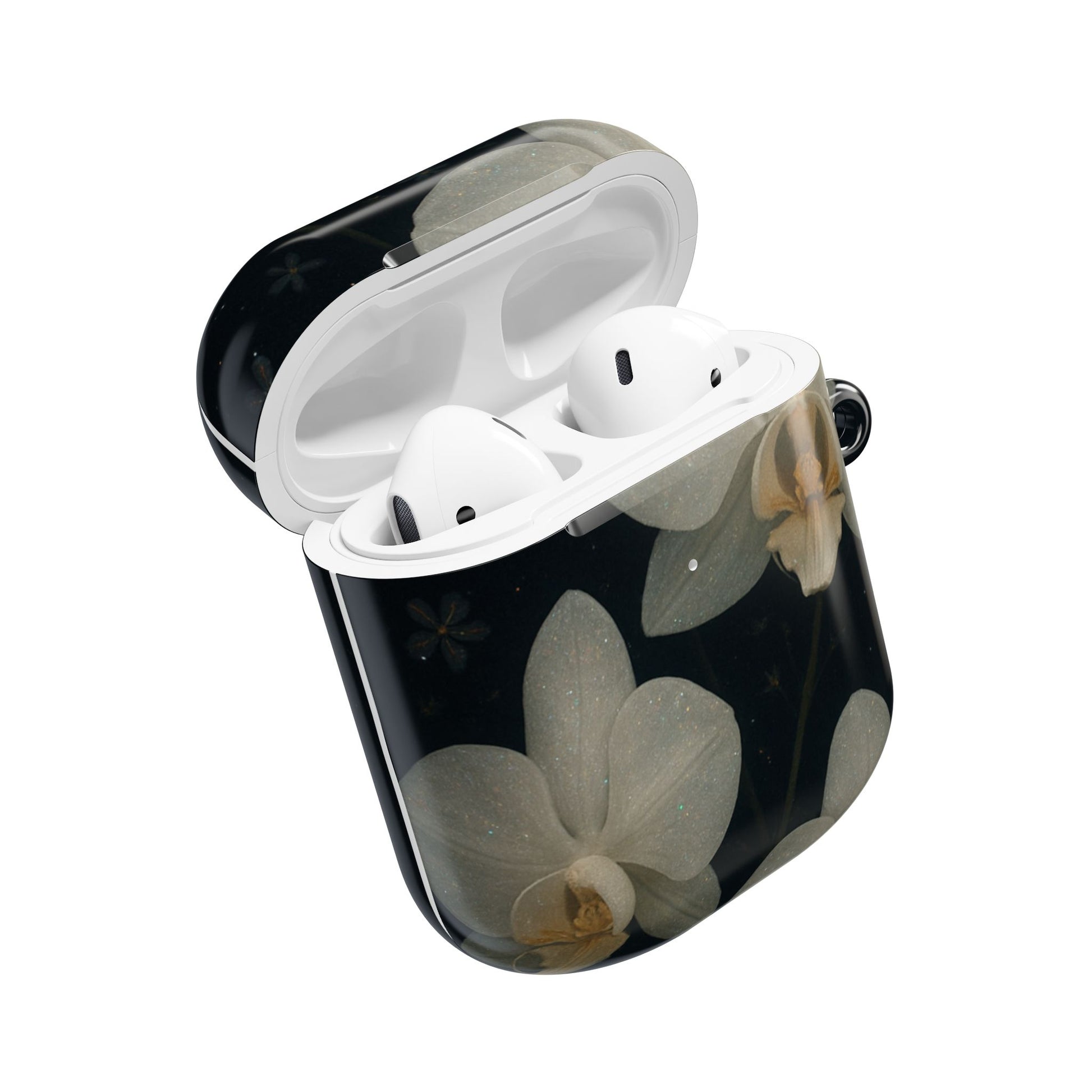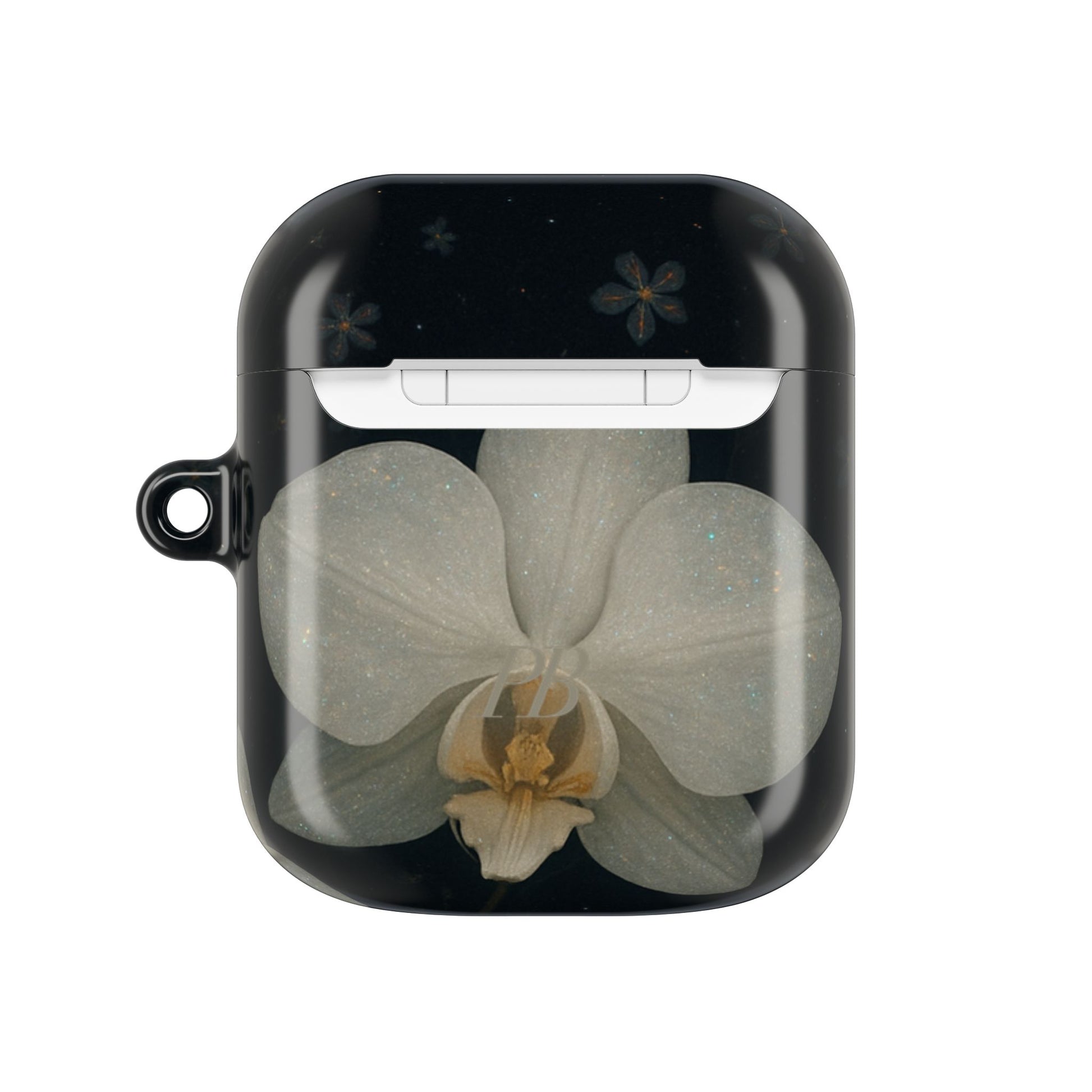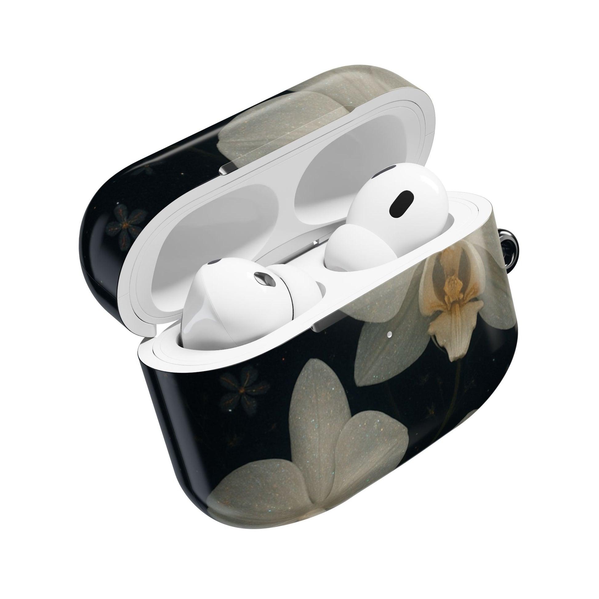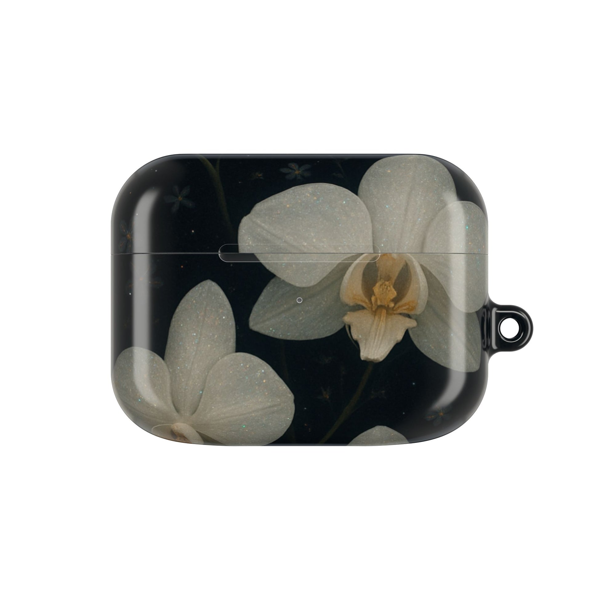 Embrace the elegance of the night with Midnight Orchid . This enchanting Airpod case features soft, ivory-white orchids blooming gently against a deep black background speckled with tiny stars and delicate blossoms.