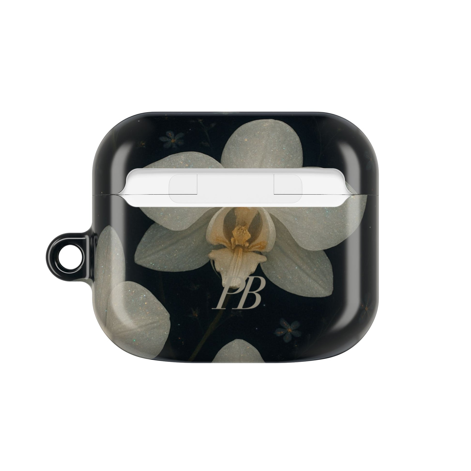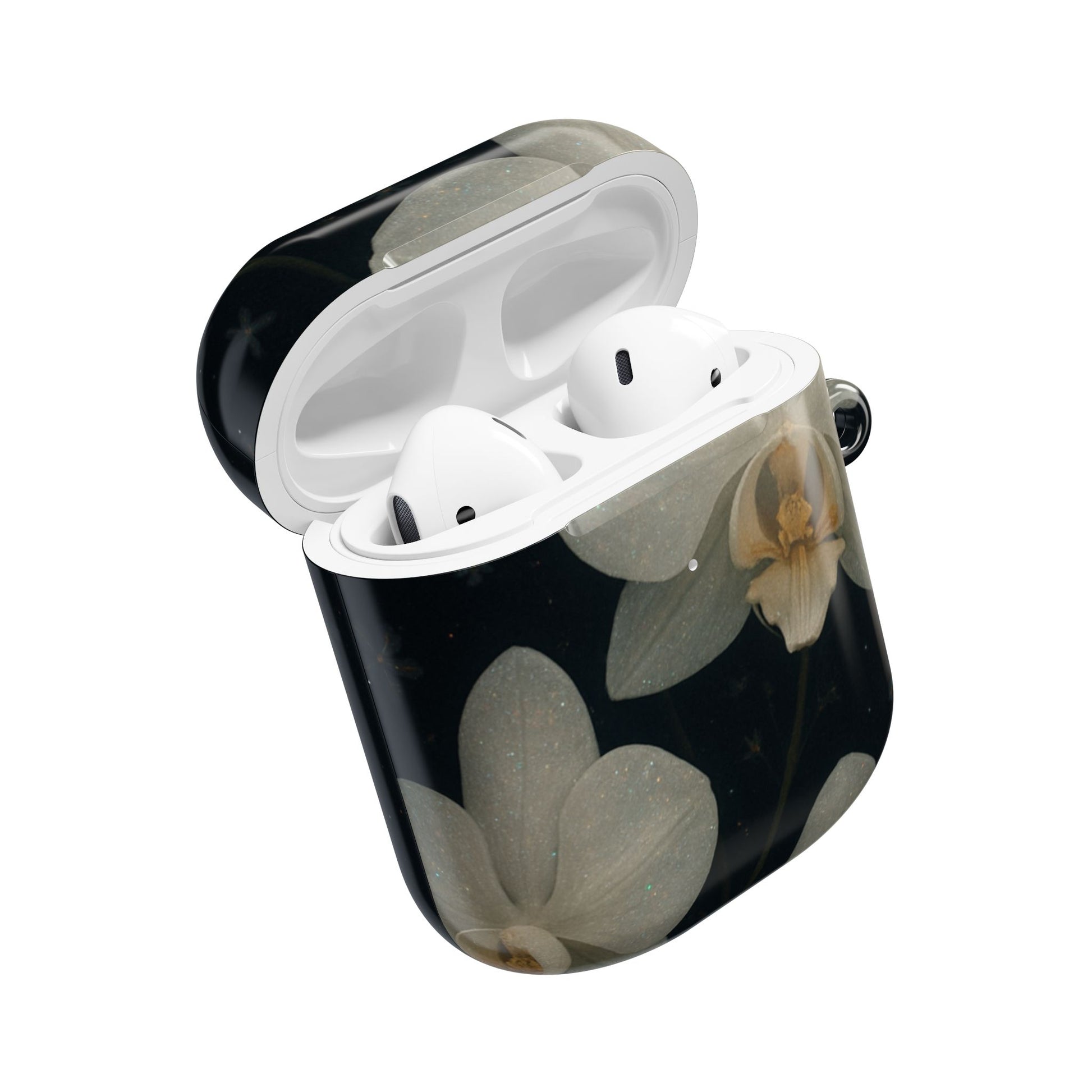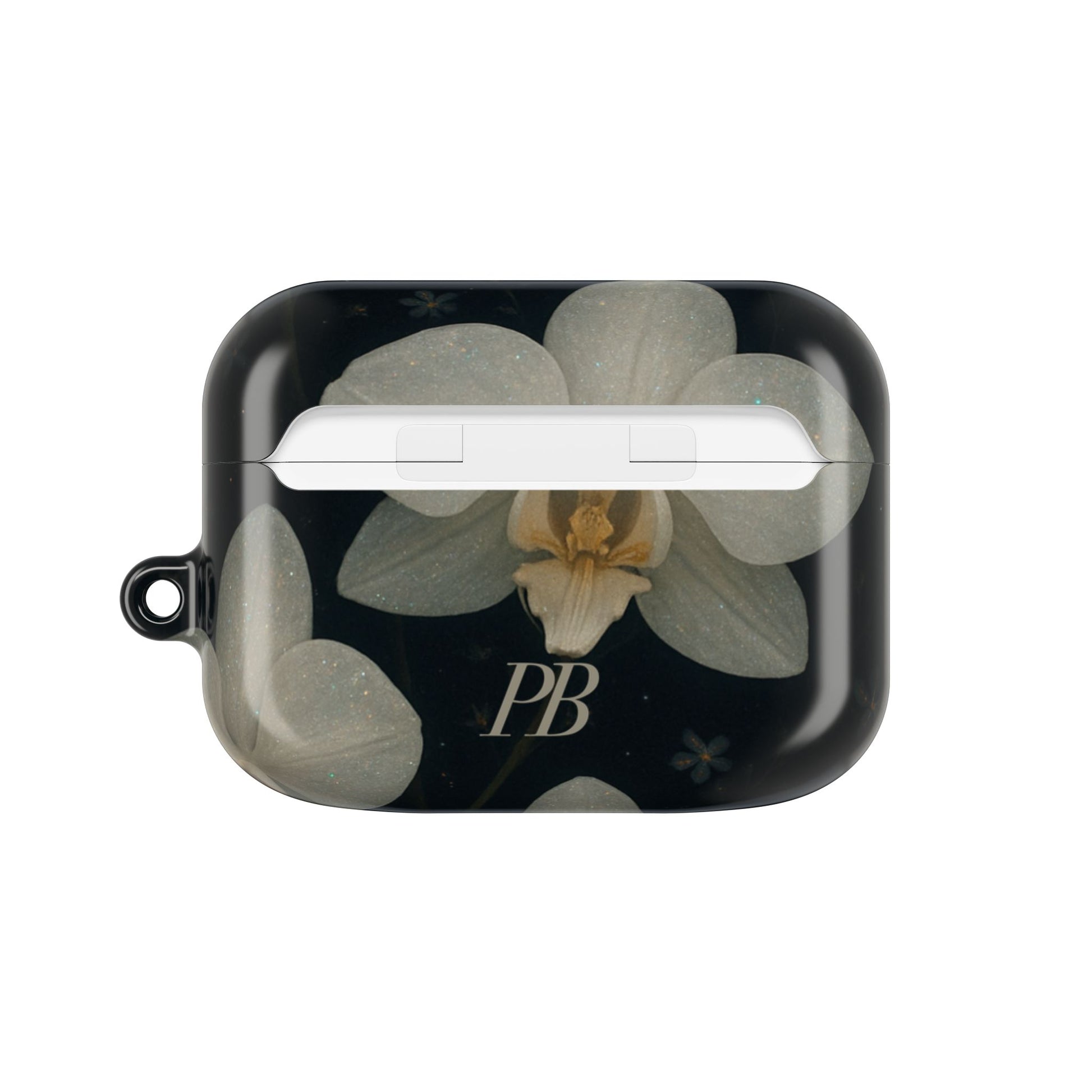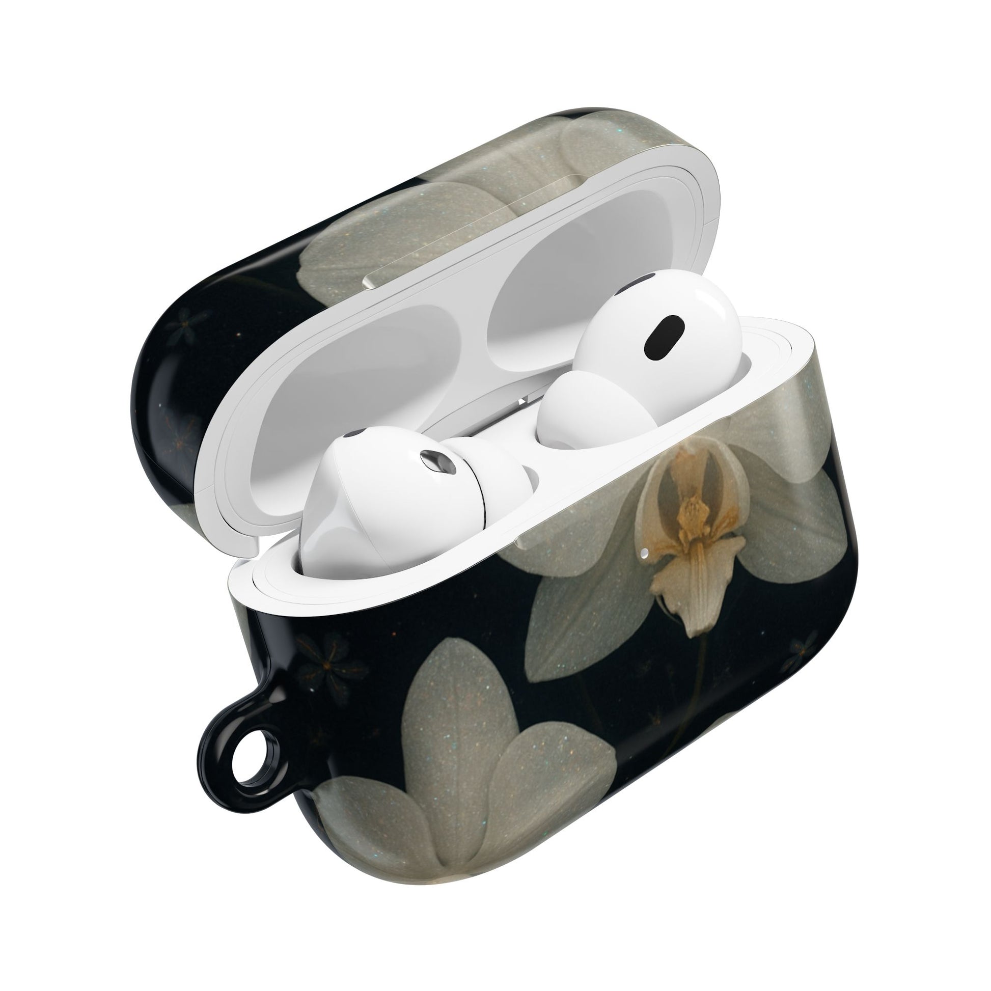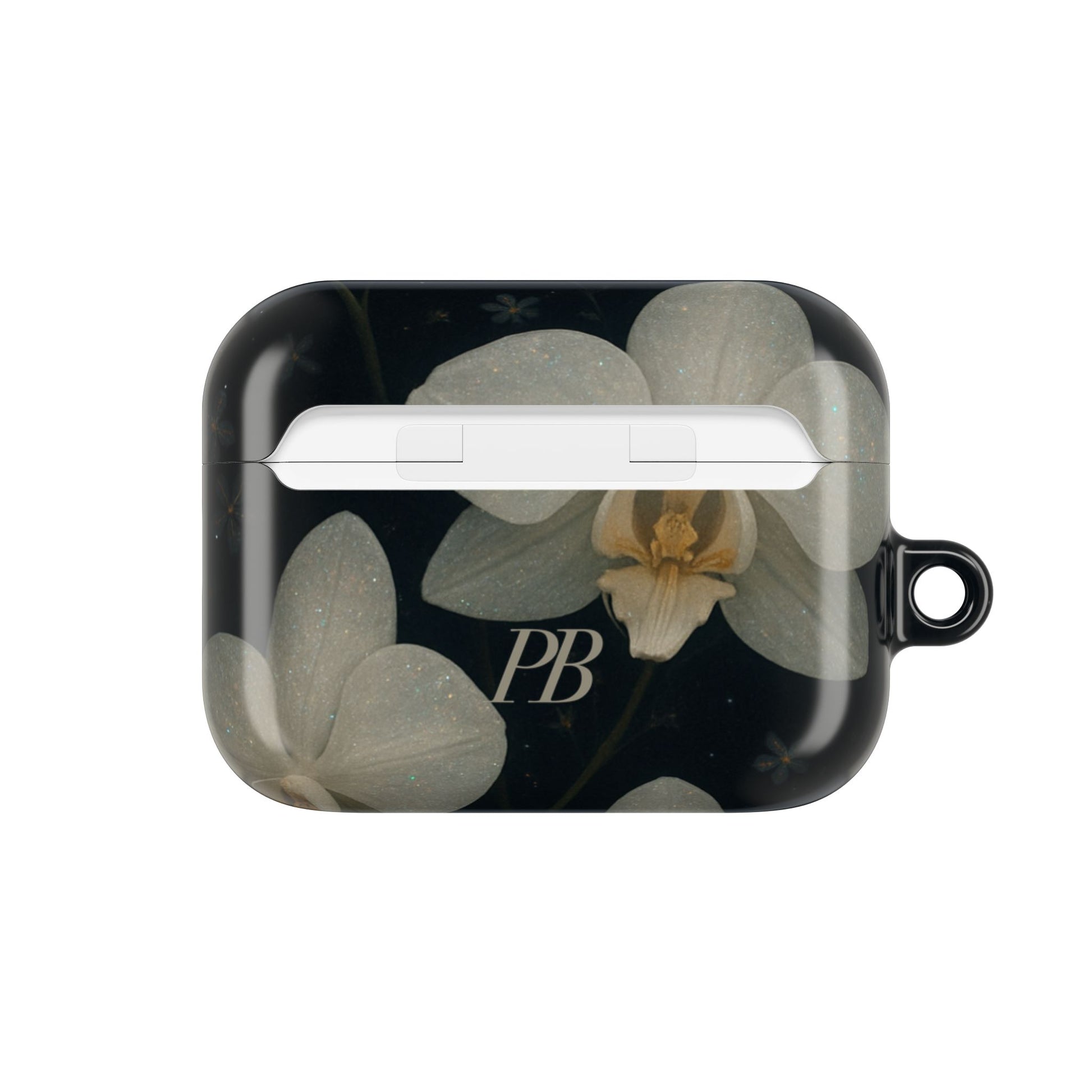 Embrace the elegance of the night with Midnight Orchid . This enchanting Airpod case features soft, ivory-white orchids blooming gently against a deep black background speckled with tiny stars and delicate blossoms.