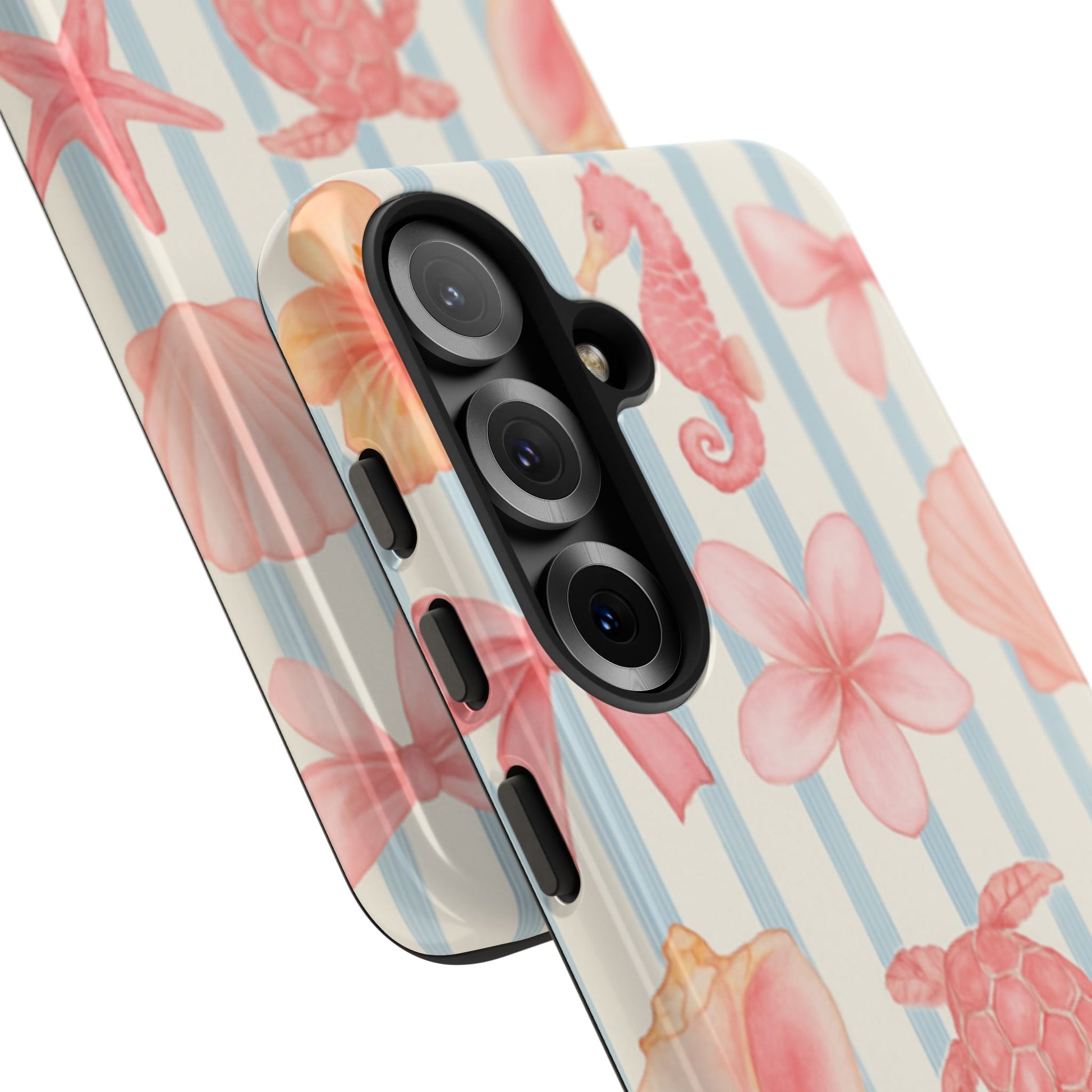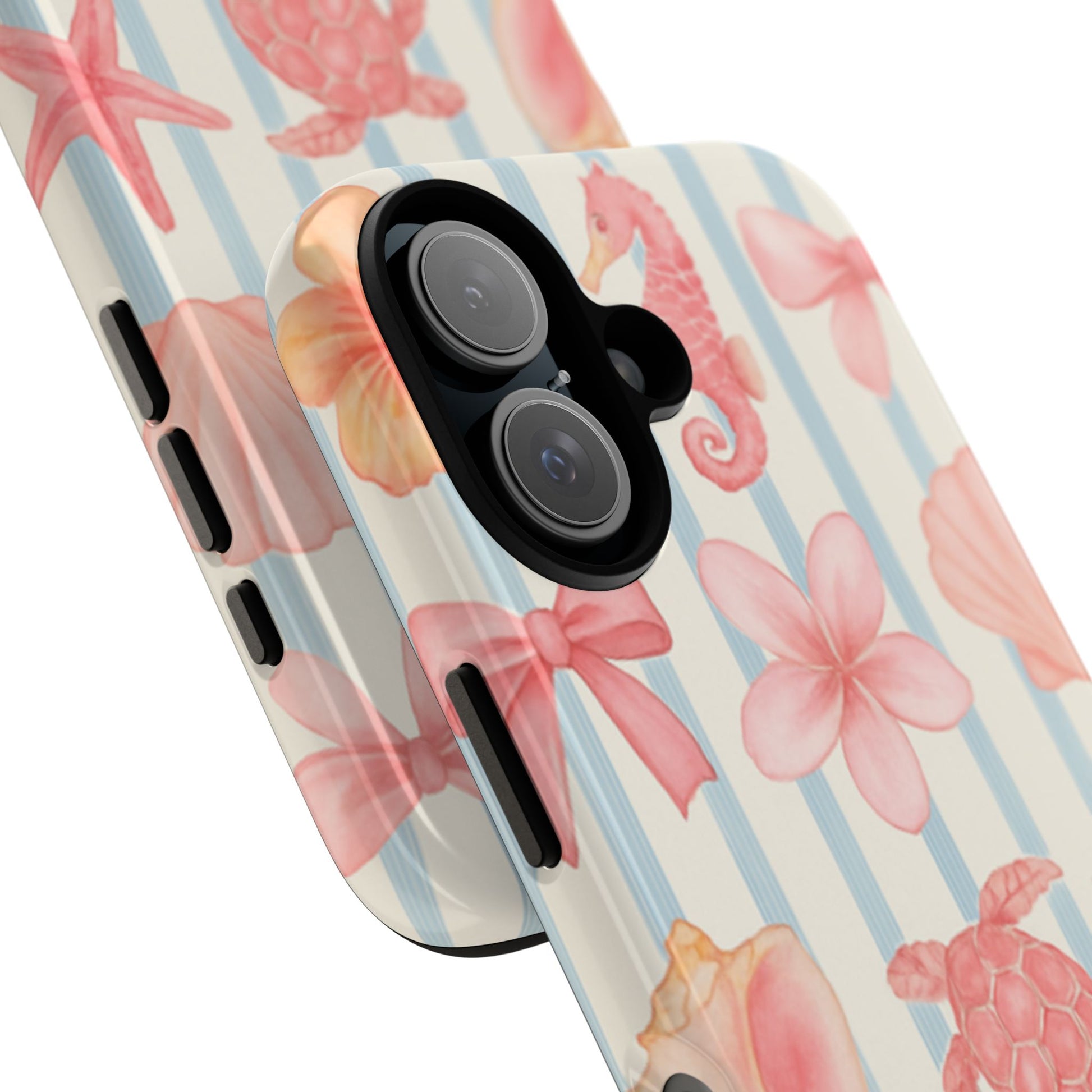 Step into a soft seaside dream with Pink Tides. Featuring hand-painted ocean treasures — from starfish and seashells to bows and blossoms — this design blends playful charm with vintage flair. The pastel pink elements dance across a background of delicate blue stripes, evoking memories of beach picnics, salt-kissed hair, and sun-faded photo albums. A gentle celebration of summer sweetness, finished with the PB signature for an extra hint of timeless style.
