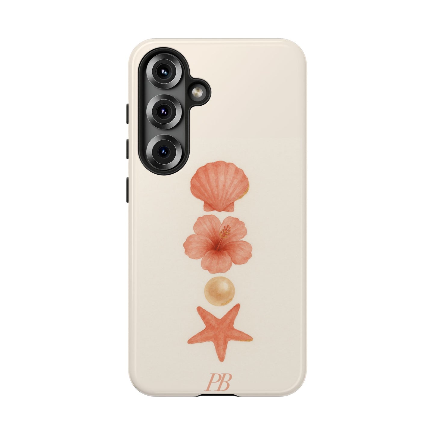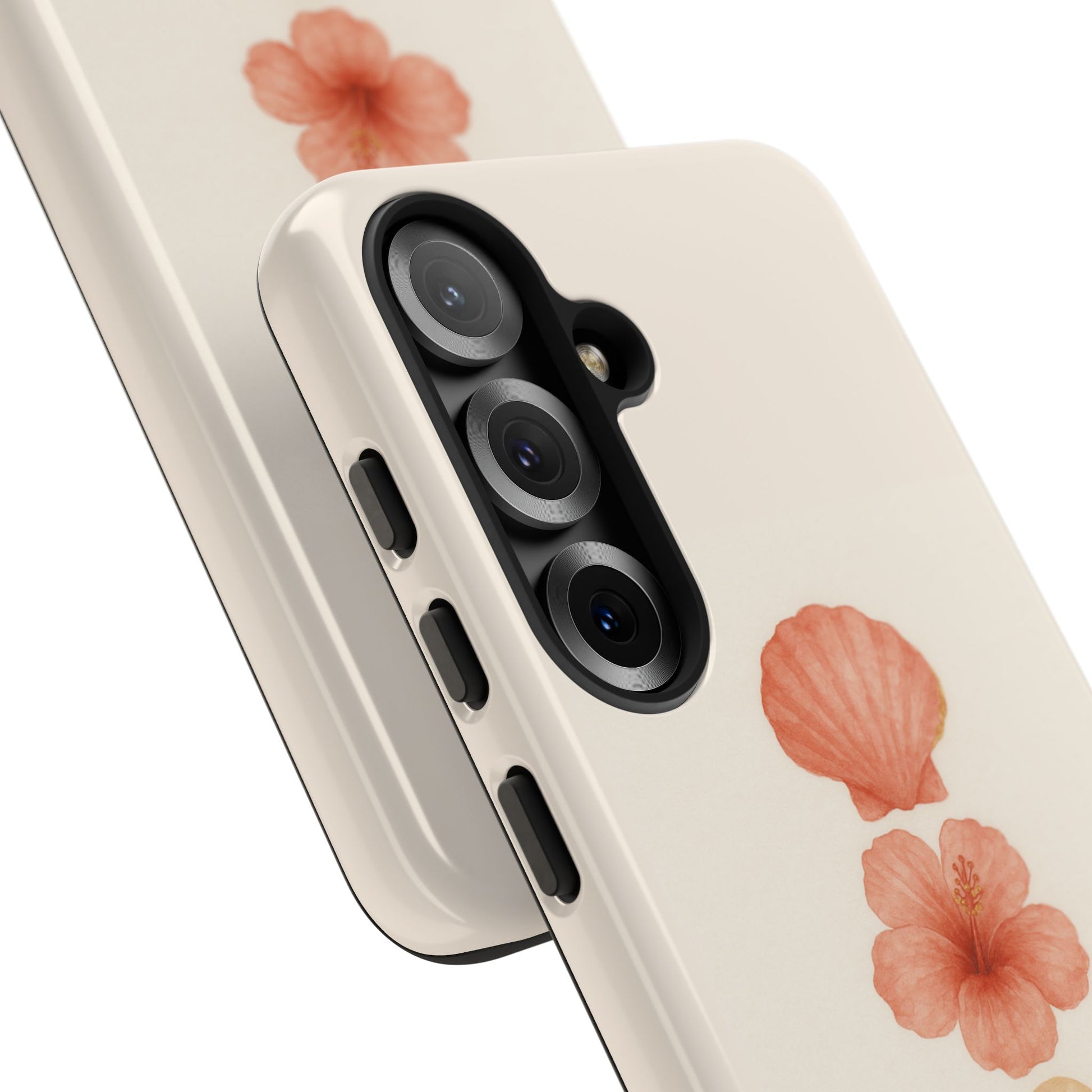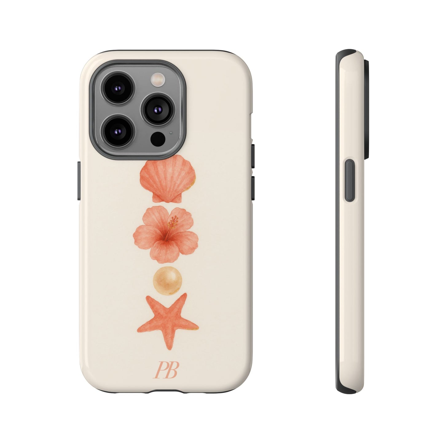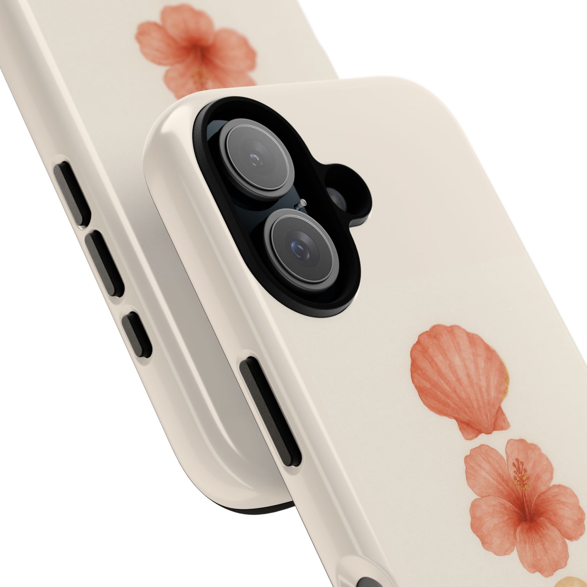 The Sunset Shore case captures the warmth of a tropical evening with soft coral tones, a delicate hibiscus flower, and ocean treasures like shells and starfish. It's the perfect blend of beachy calm and sunset romance – a gentle reminder of summer no matter where you are.